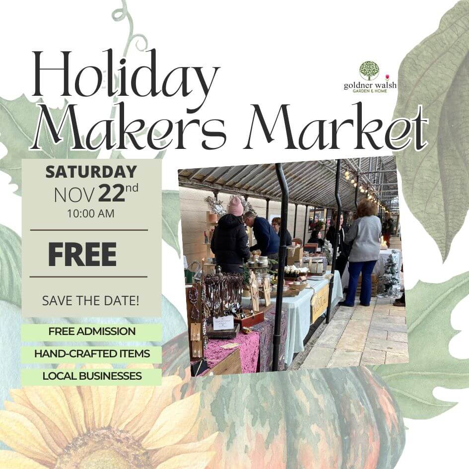 Holiday Makers Market + Add to Google Calendar + iCal / Outlook export Date November 22, 2025 Time 10:00 am Location Goldner Walsh 559 Orchard Lake Rd Pontiac MI Organizer Goldner Walsh Phone (248) 332-6430 Share this event