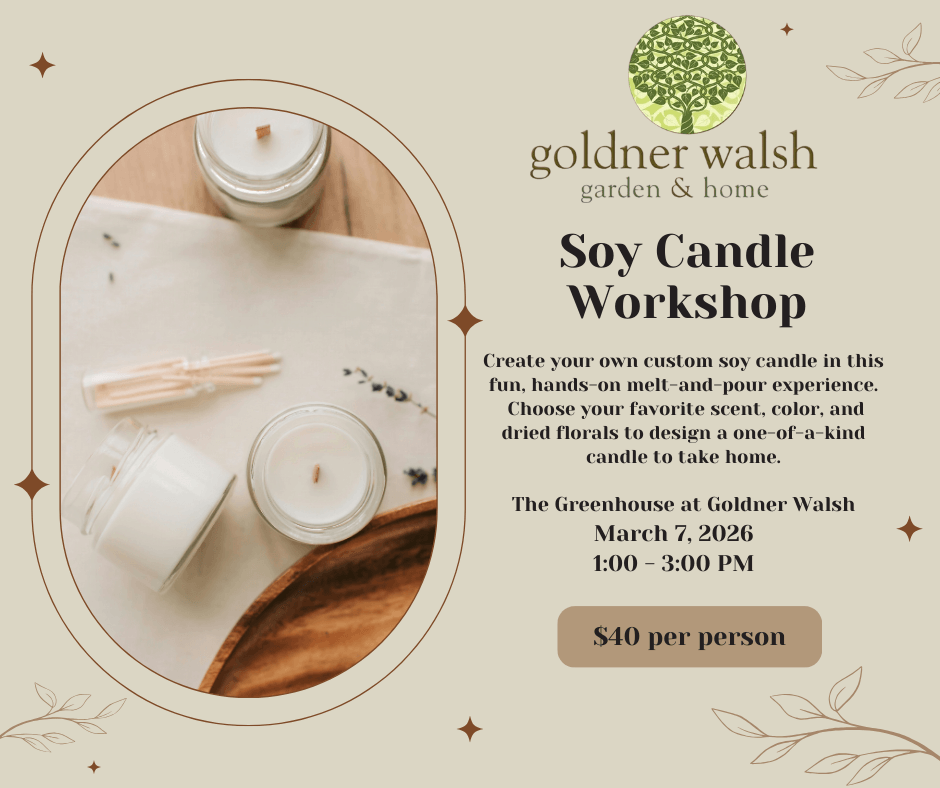 Join us for our Soy Candle Workshop! You can melt and pour your own soy candles. Choose between the scents: lavender, rose, jasmine, eucalyptus, peppermint, and lemon. You can also choose the color of the wax and add various dried flowers.